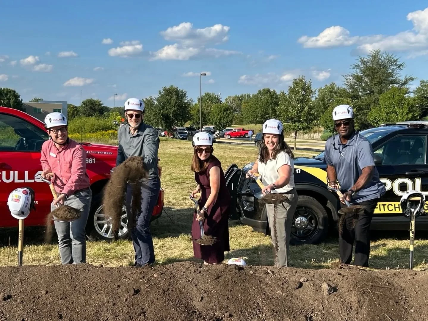 Left to right: Alder Logan Reigstad, Alder Bill Jetzer, Mayor Julia Arata-Fratta, Alder Gabriella Gerhardt, and former Alder Jim Wheeler at the groundbreaking of the Fitchburg Police Services Facility.